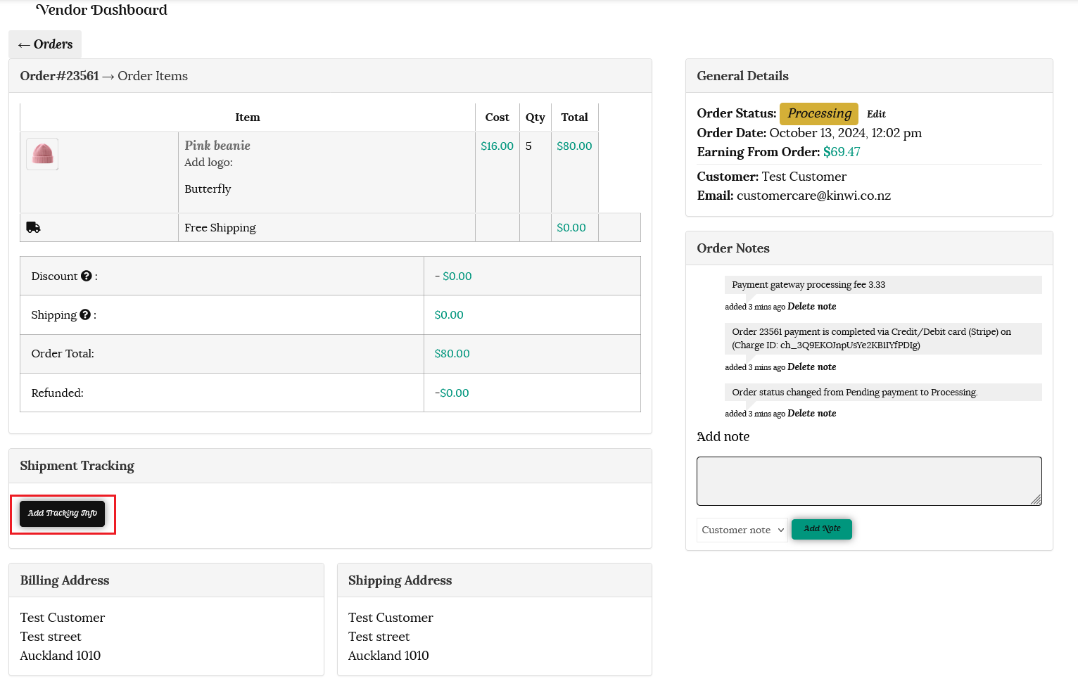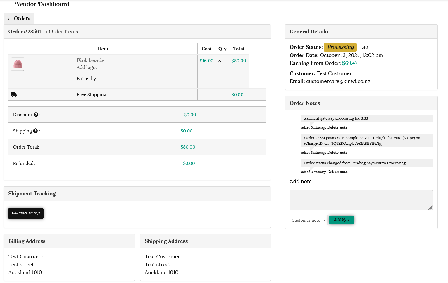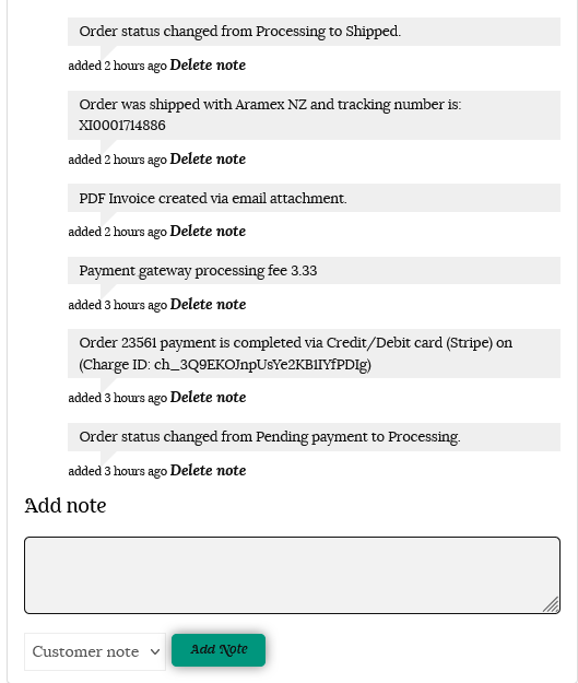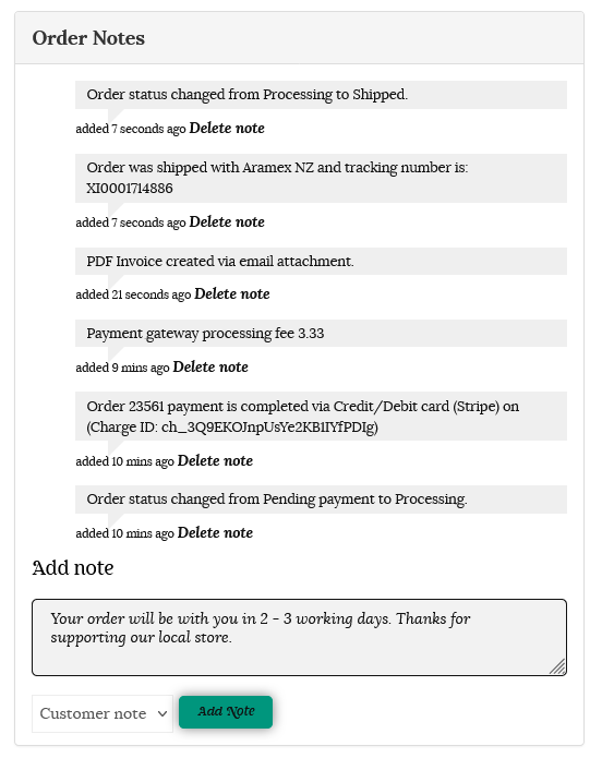 Order Notes contain details of the order, and include payment details, processing fees and shipping details.