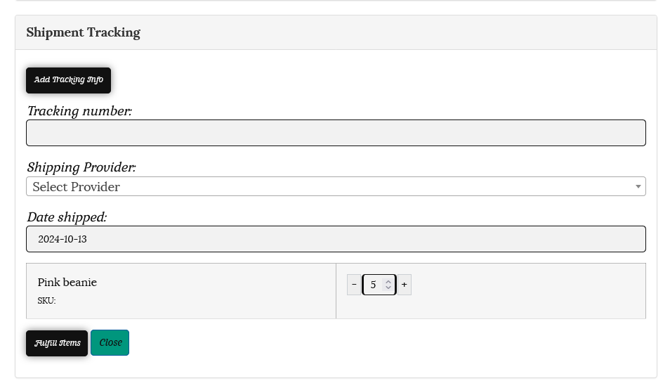 Once you have safely packaged the customer’s order and it is ready to go, you can create a shipment by adding the tracking details. Scroll down and click on the “Add Tracking Info” button.