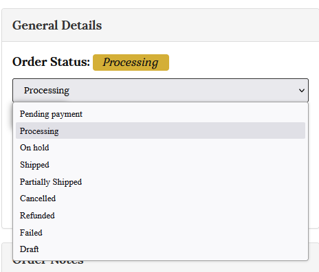You are able to edit the order status to suit using the dropdown menu. Options include; Shipped, partially shipped, cancelled, refunded.