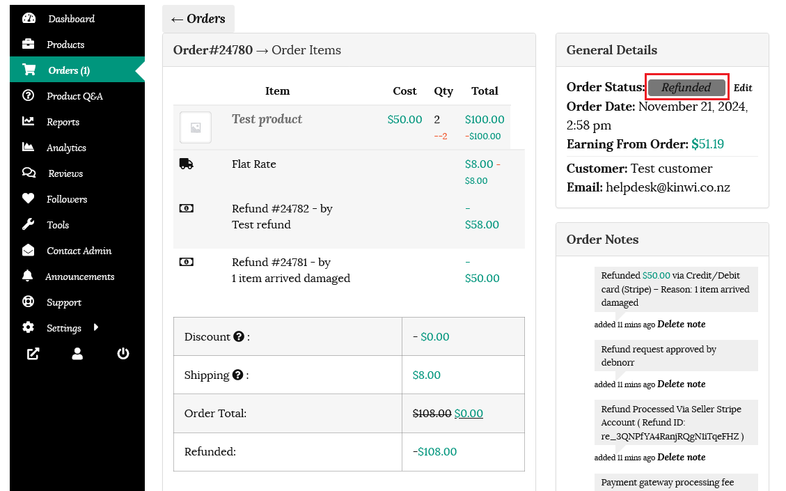 The refund amount will now be disbursed automatically to the customer’s account via Stripe. The details will show on the order as seen below.