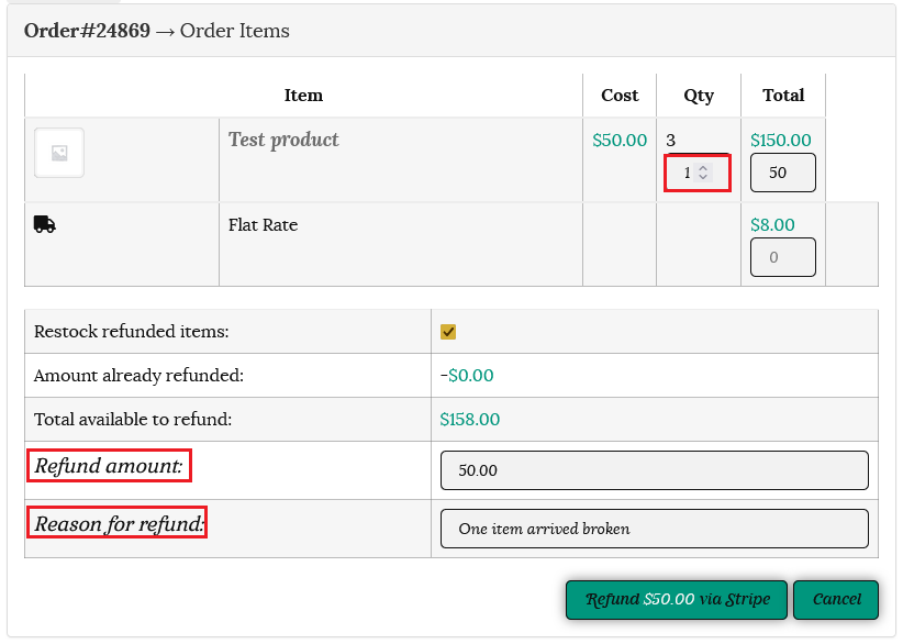 Enter the refund details on the form. Select the quantity for each product, the refund amount and reason for the refund. Click on the refund via Stripe button.
