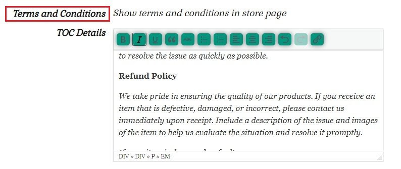 An example of a returns/refund policy is below. Change the details to suit your store. Add this policy to your Terms and Conditions found by going to your store dashboard > Settings > Store and scrolling down to the Terms and Conditions section.