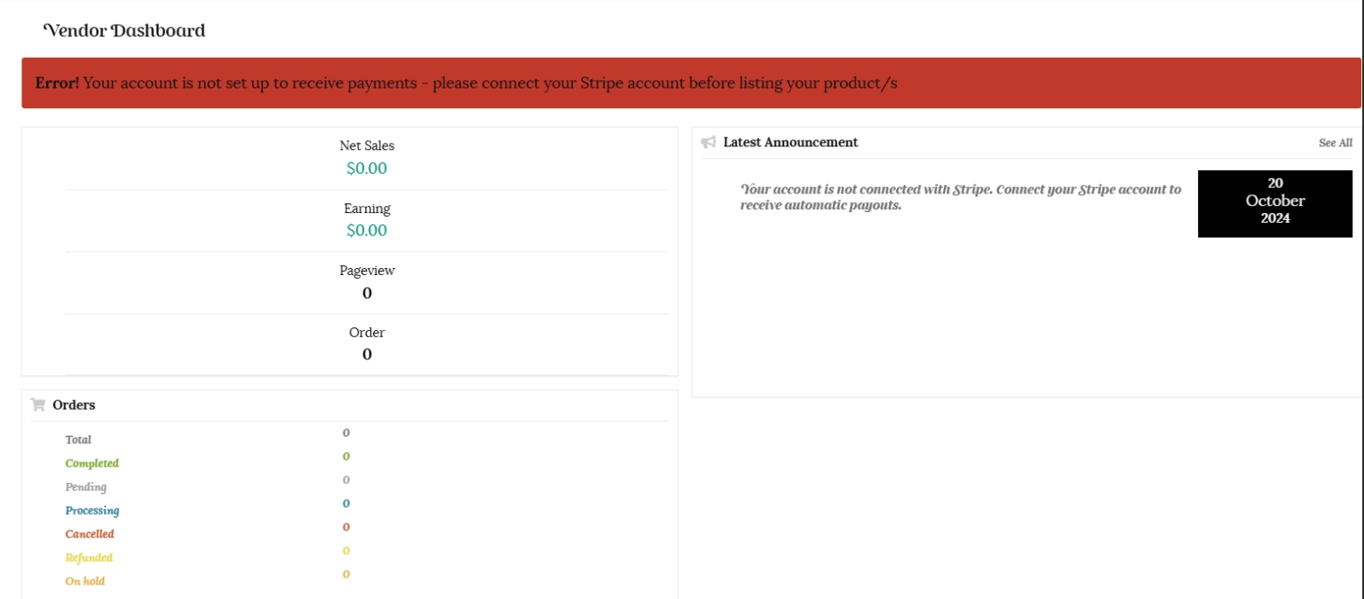 Please note, until your account is connected to receive payments you will see the warning message in red below. Instructions on connecting your account to Stripe can be found in the next tutorial. You will not be able to list products until your account has been connected to receive payments. You will receive an email once your vendor account has been successfully activated.