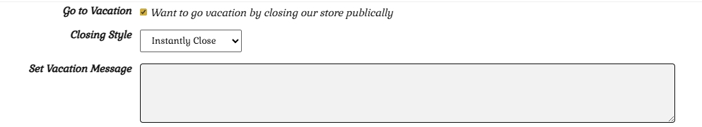 If you wish to go on vacation, this is where you select your message and time to close your store.