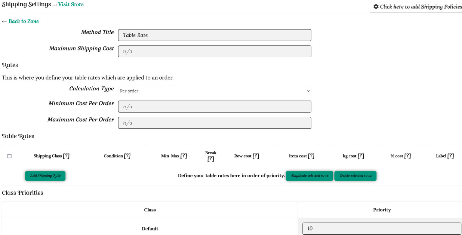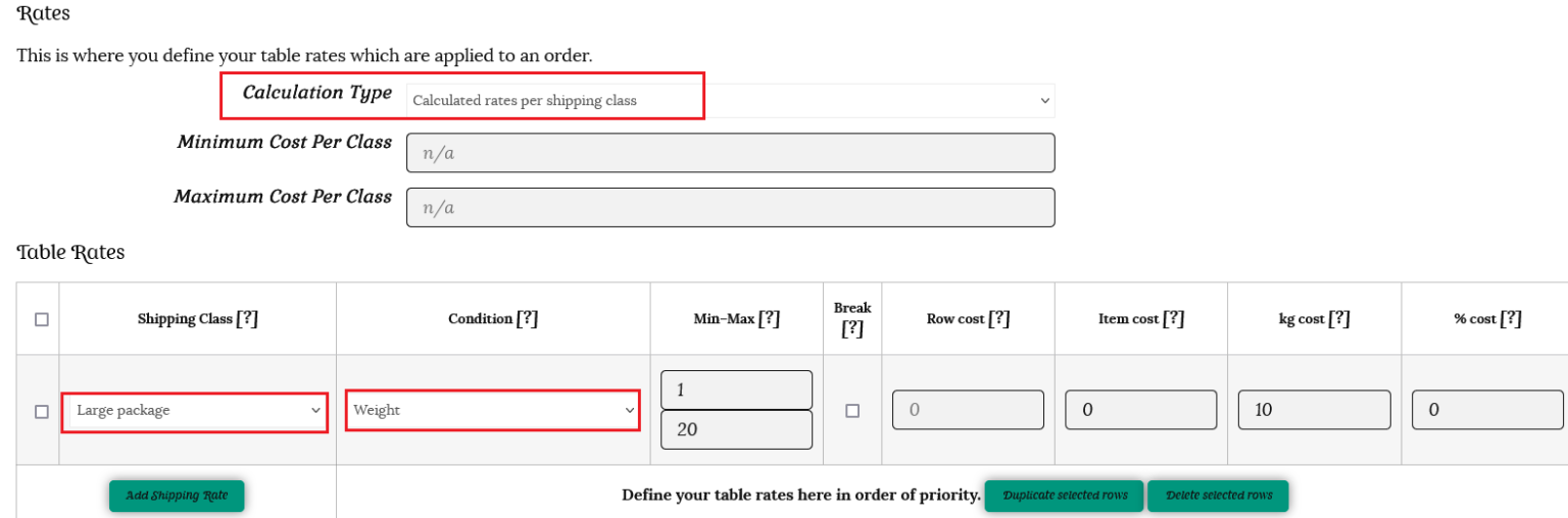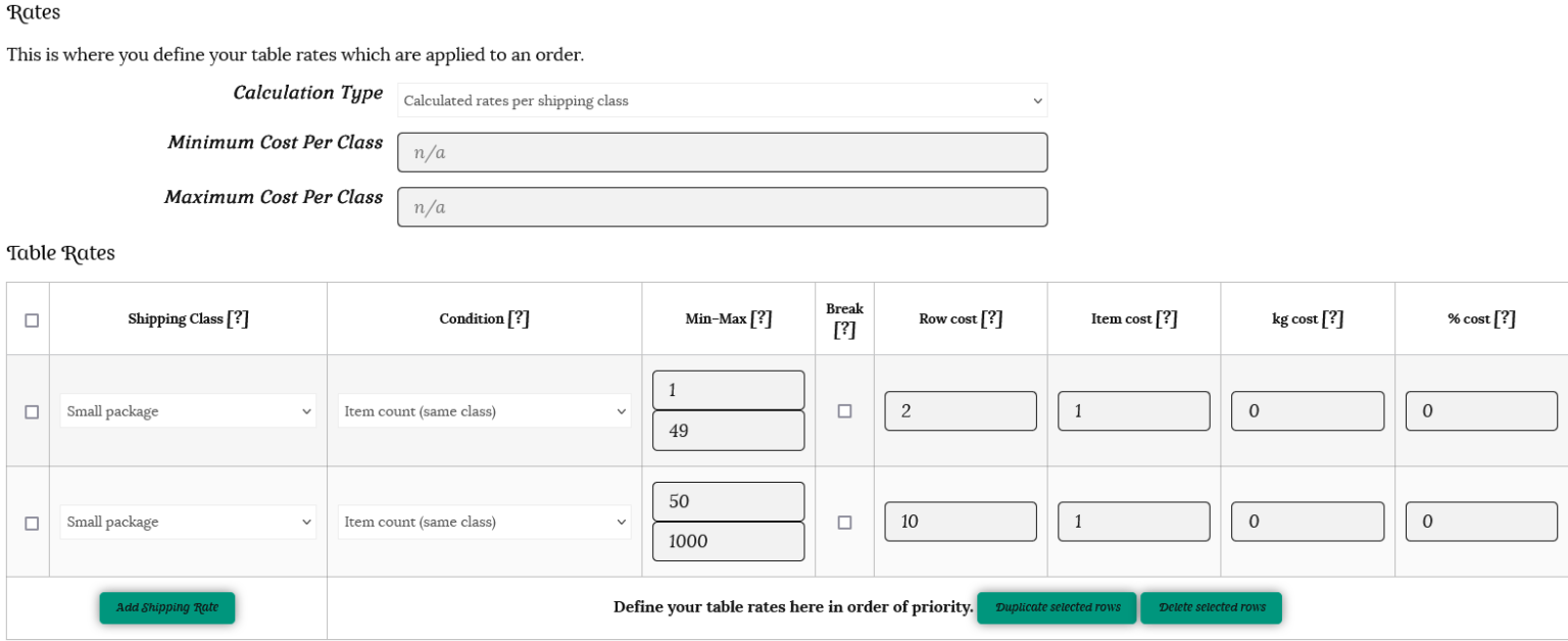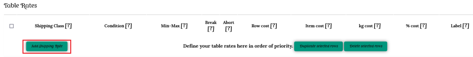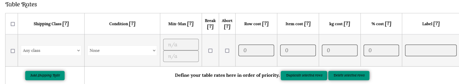 This will open up a table where you can enter your shipping rates. Define your table rates here in order of priority – the highest shipping cost should be added first.