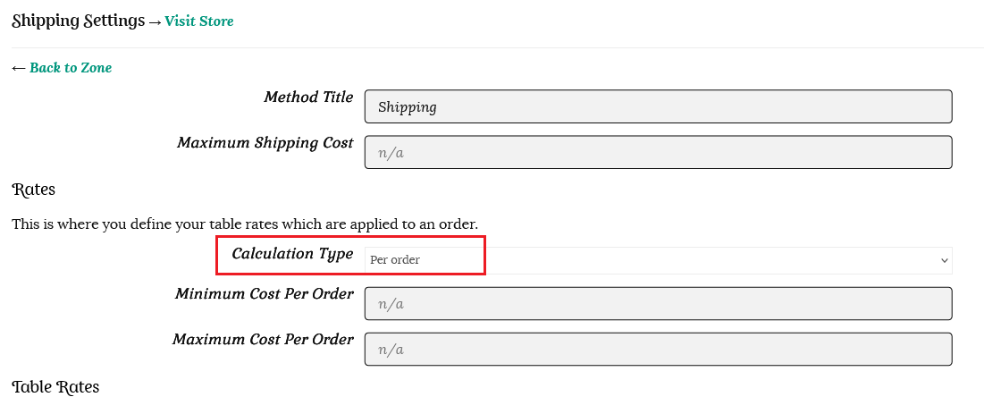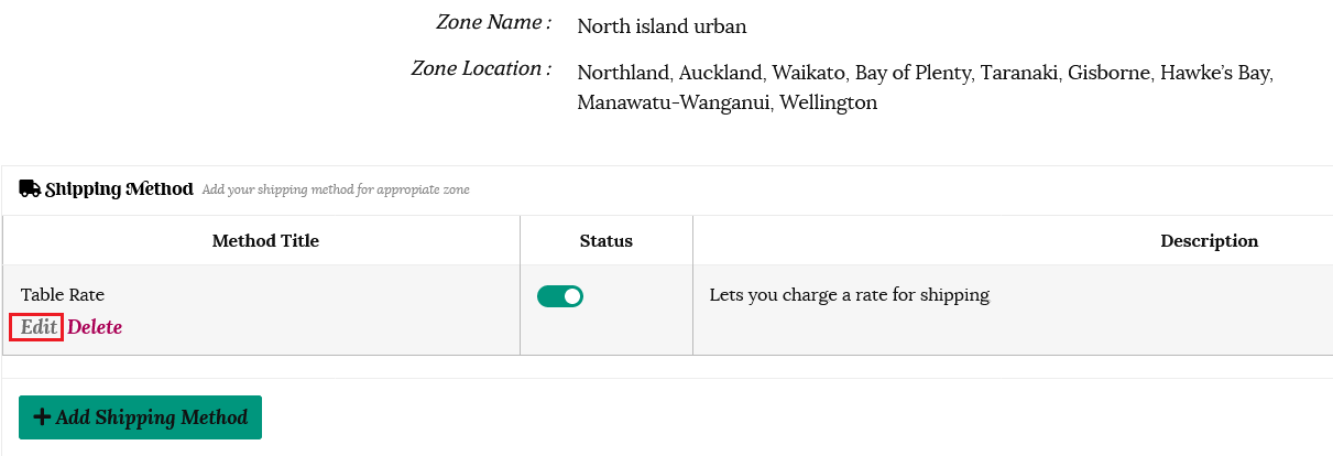 Table Rate will now be shown as a shipping method for your chosen zone. Click Edit to set your rates.