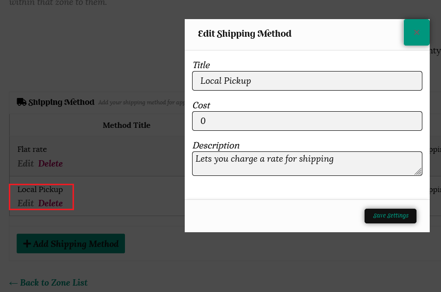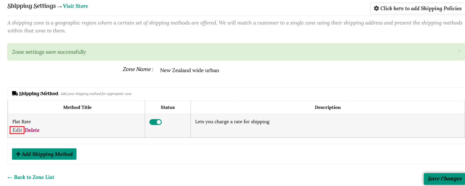 This will take you back to the shipping method page for that zone. Flat Rate will now be shown as a shipping option. Click “Edit” to set your rates.