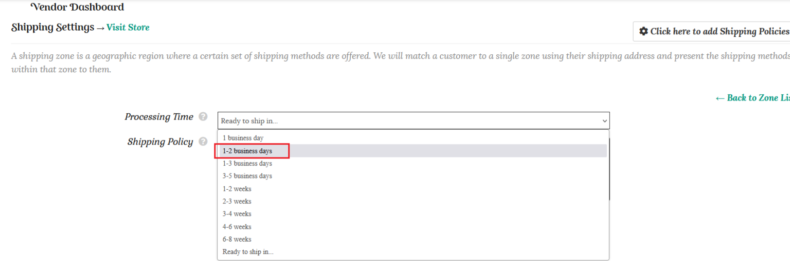 Unless you sell customised items, we expect that you will ship your items in 1 -2 business days, so select this option from the dropdown.
