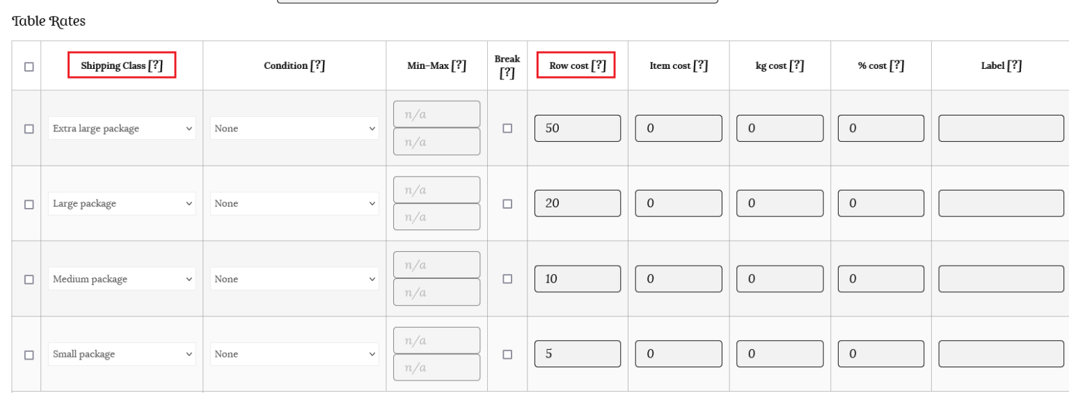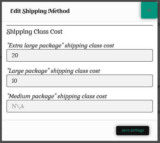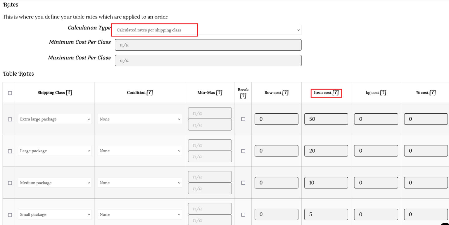 Now you can add your different shipping class costs. If you do not need to use all the classes, just leave them as N/A.