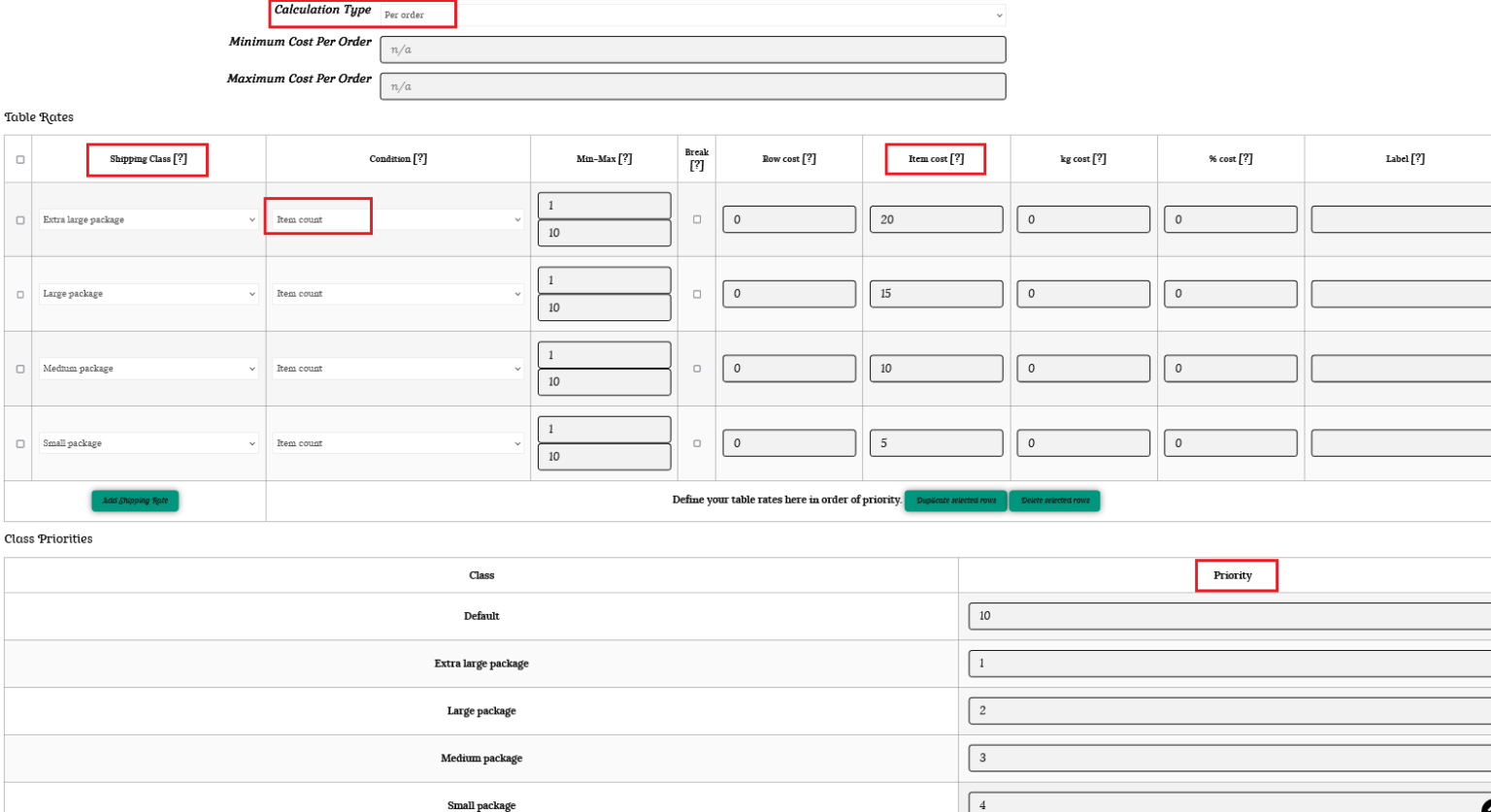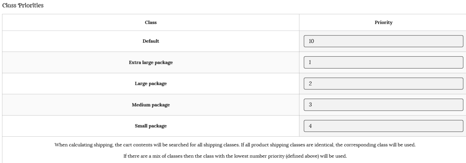 Per order – calculates shipping for the entire cart. If there are varying shipping classes in the customer’s cart, the class with the highest priority will be used for all items (where 1 is the highest priority).