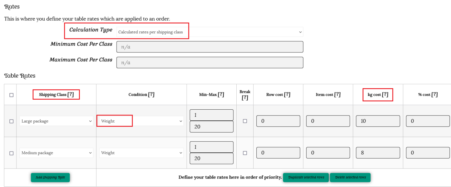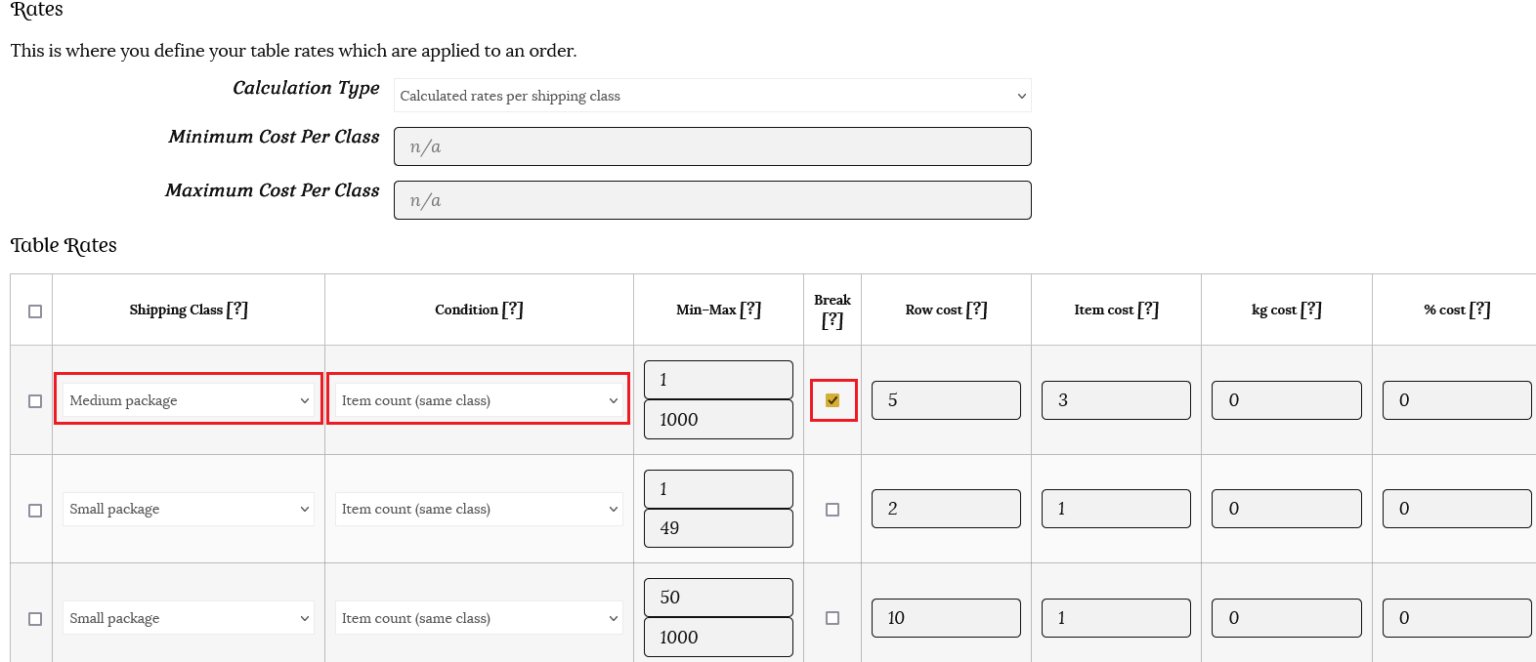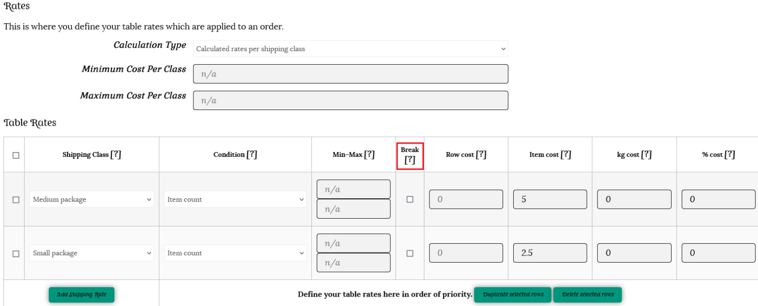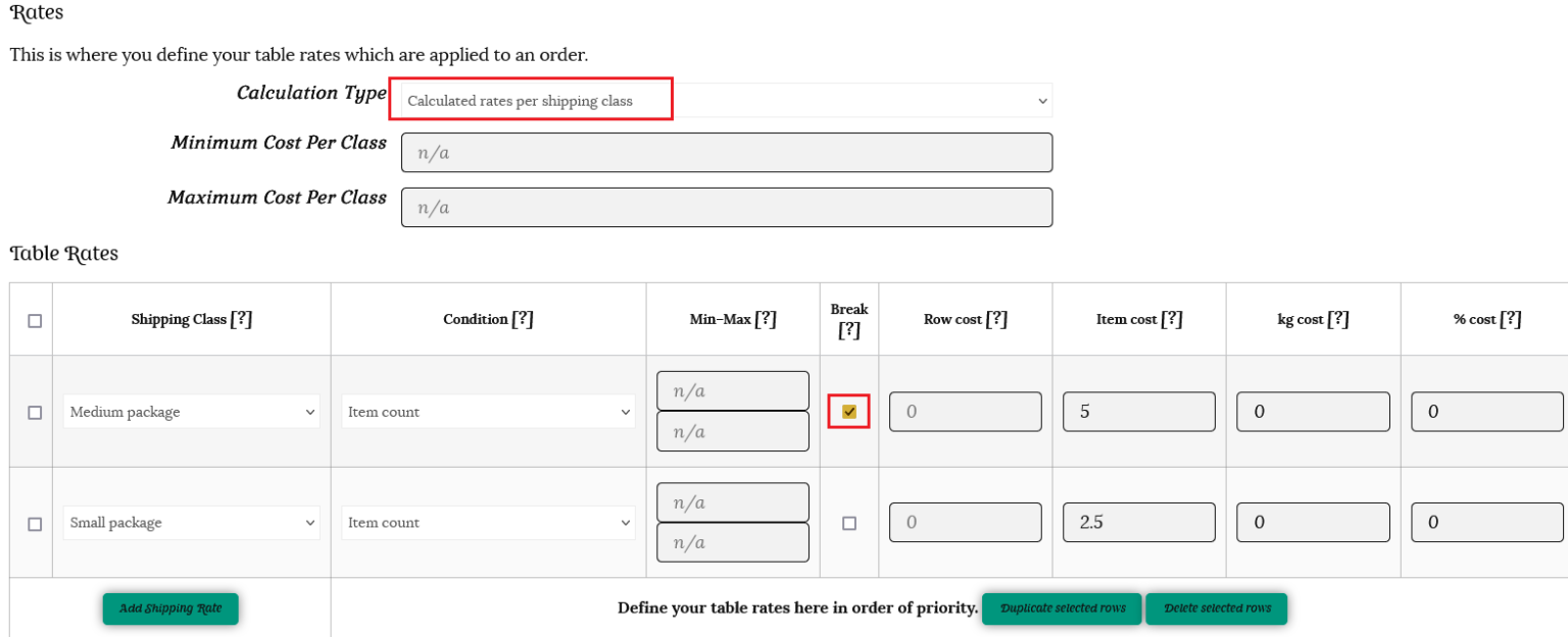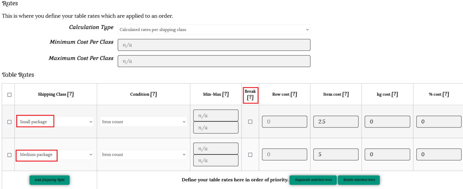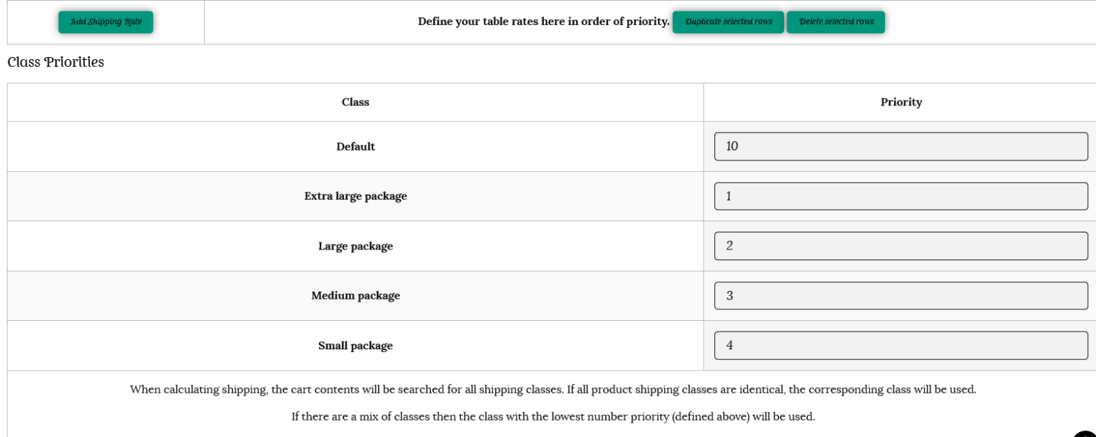 ii) Create rates on the table, with the highest rate at the top. In our example of books and bookmarks, the medium shipping class is above the small shipping class.