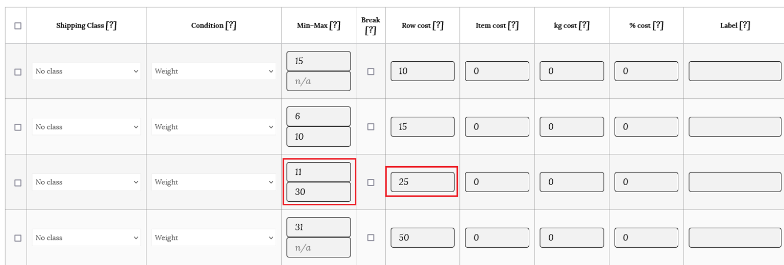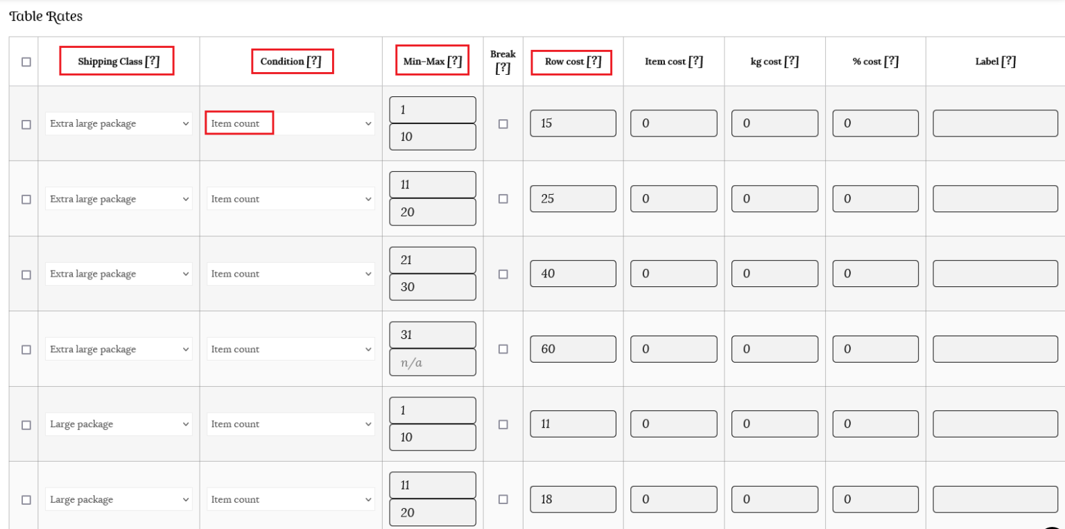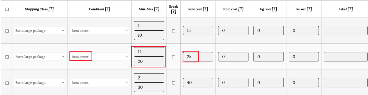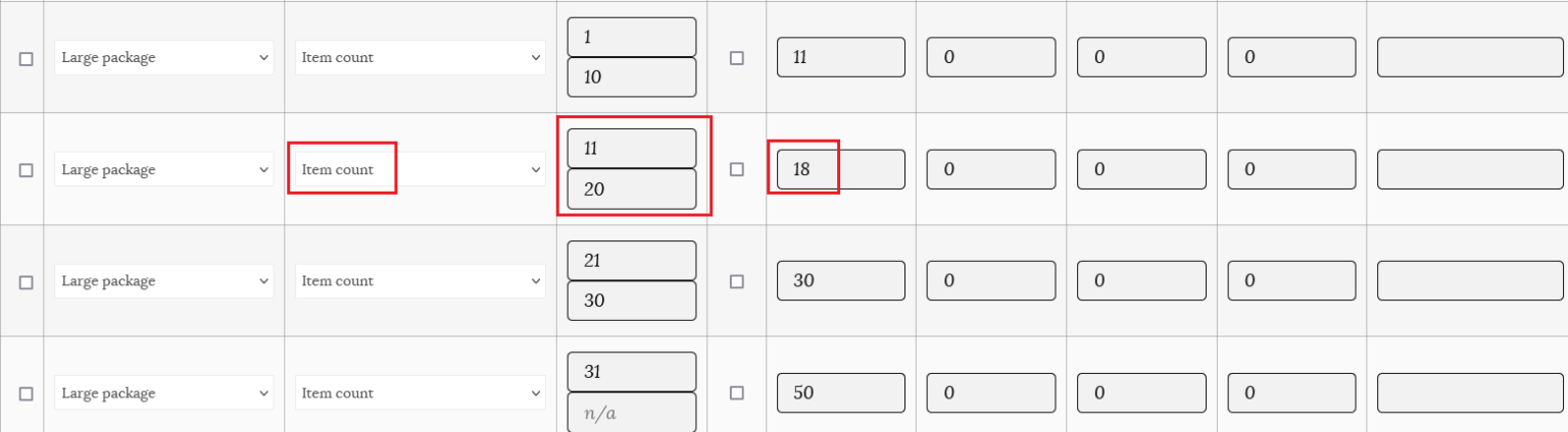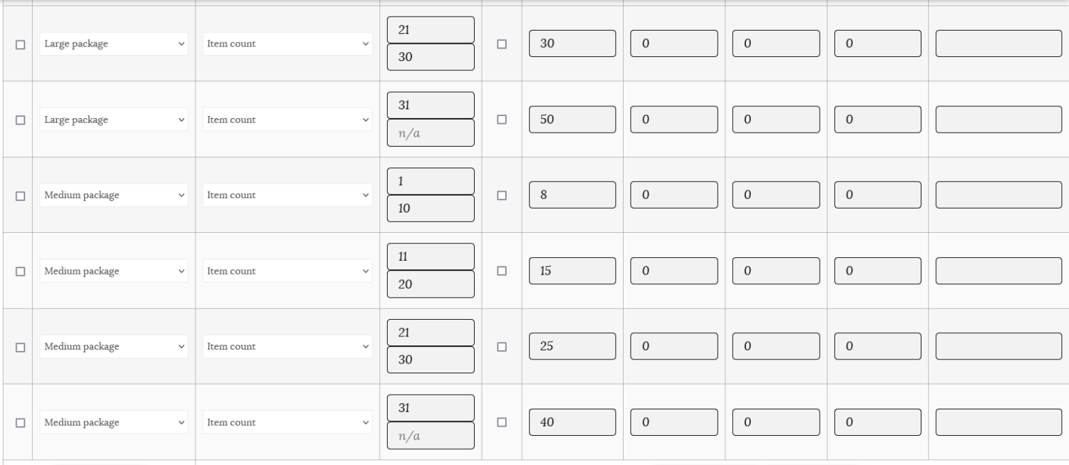 Note: If you are filling in minimum and maximum amounts for your item, ensure that you account for as many items as a customer would conceivably order. For example, for item count, it’s good practice to have a row that has a maximum up to 999. This will ensure that shipping rates will always be calculated.