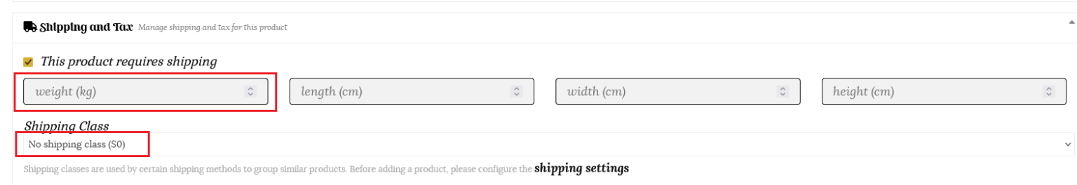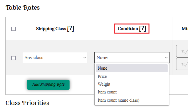 Using weight as the condition – Instead of specifying separate classes, you can use “no class” or “any class” to set your shipping rates based on weight. You will need to assign a weight value to every product listed for this condition to calculate the shipping accurately.