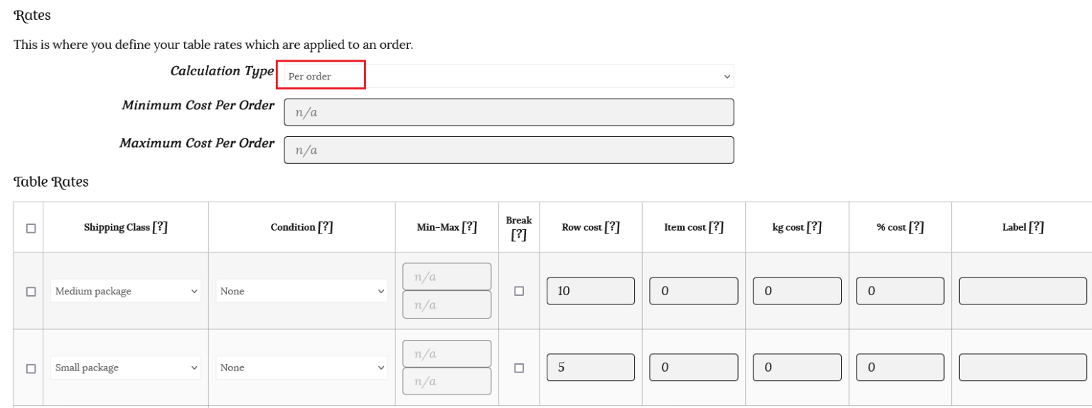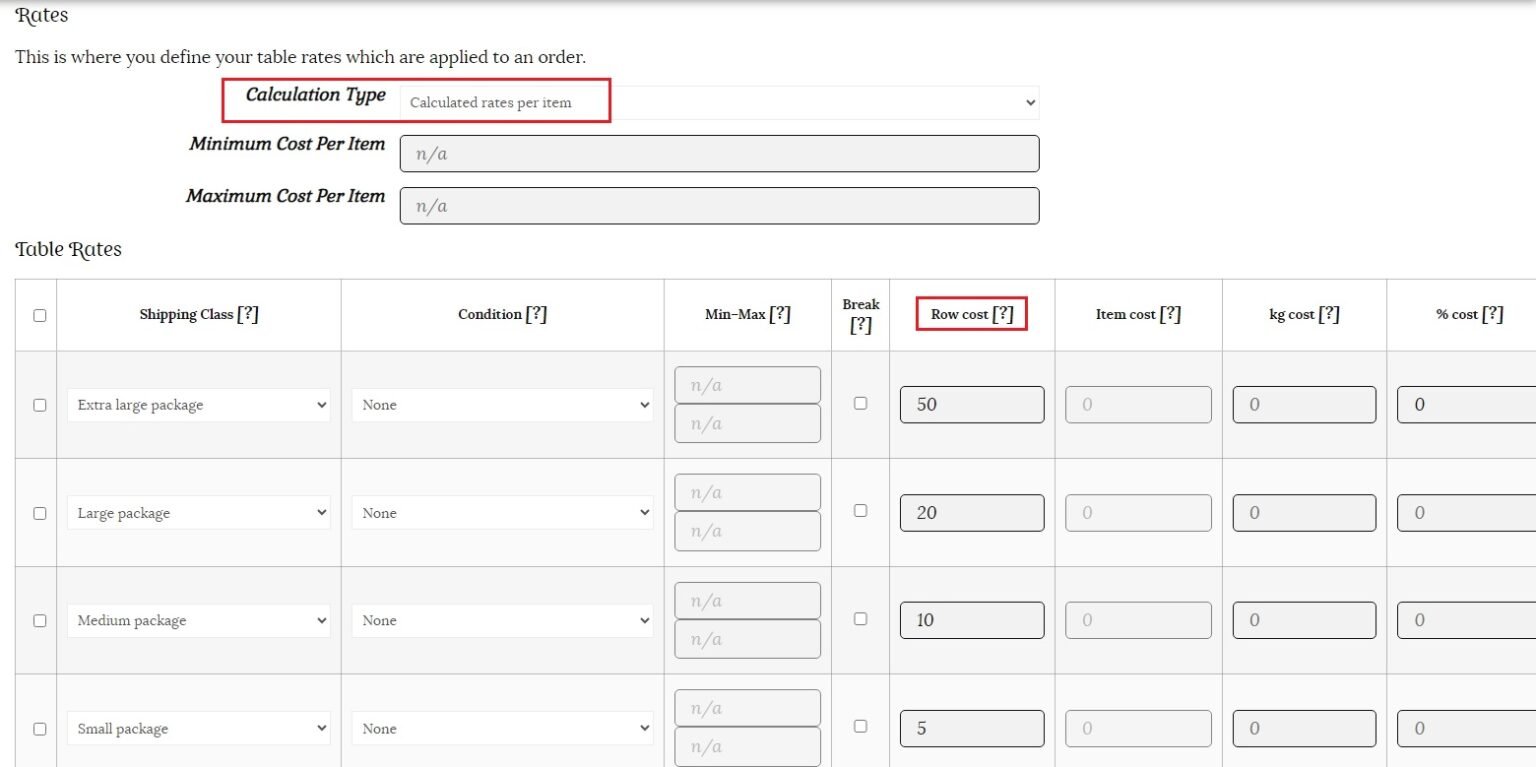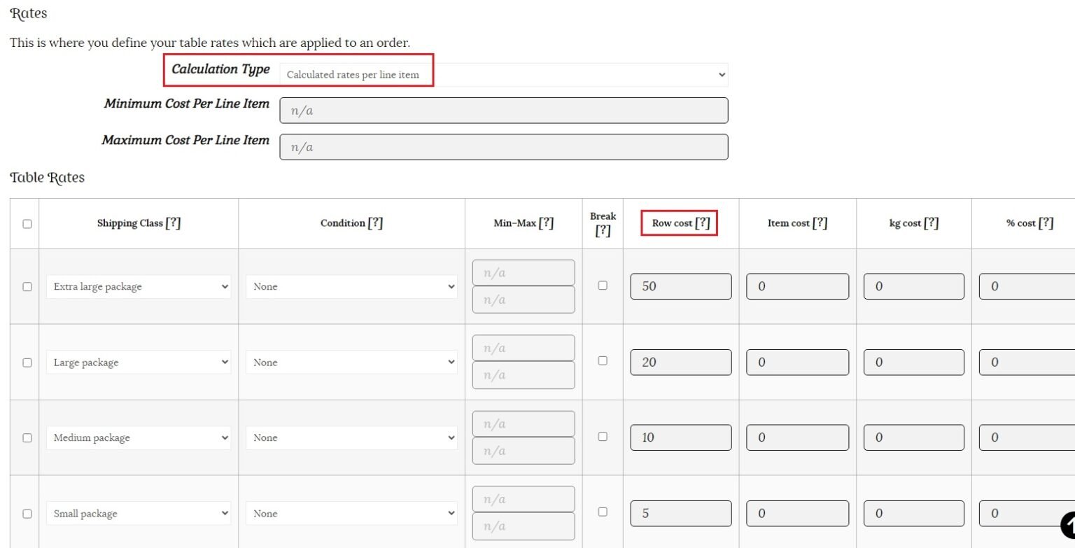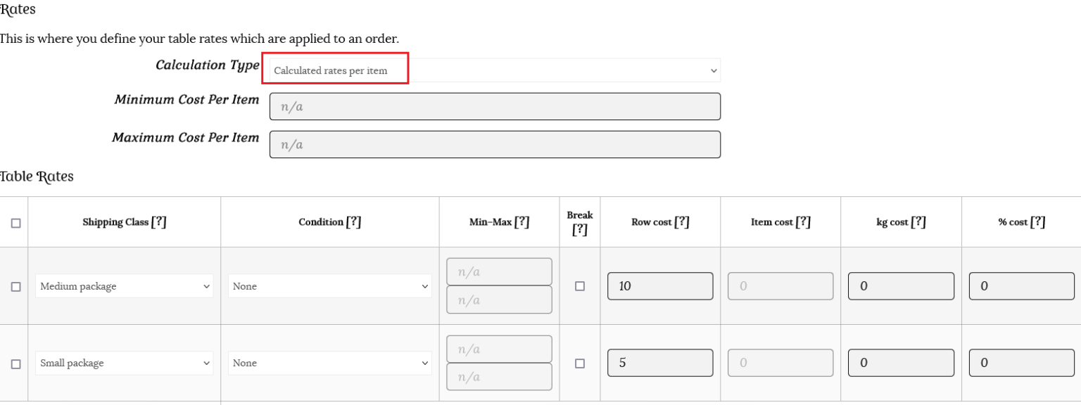 This time we will use the same row cost rates, but choose “Calculated rates per item” as the calculation type. This option counts the shipping based on the price, weight, etc. There is no label option for this calculation type.