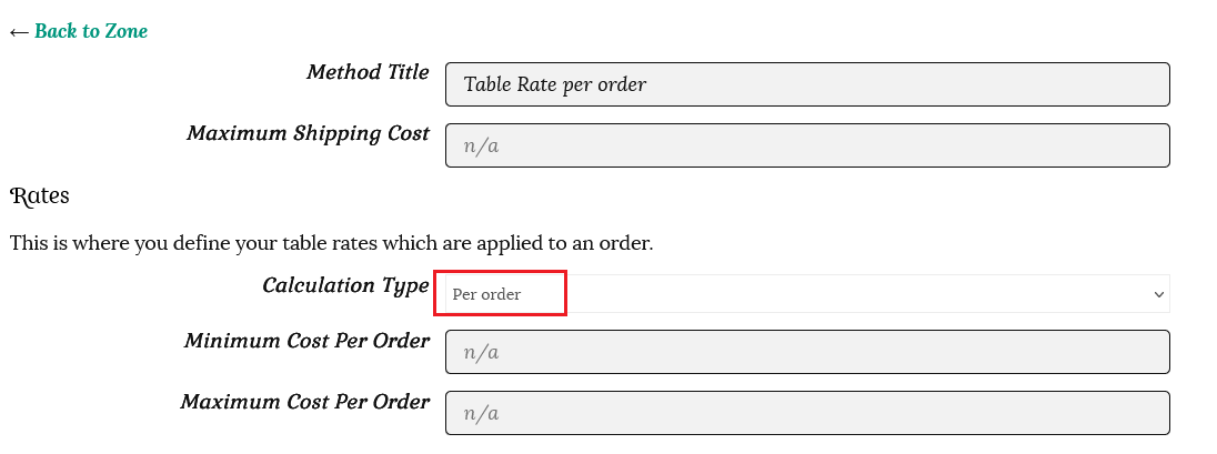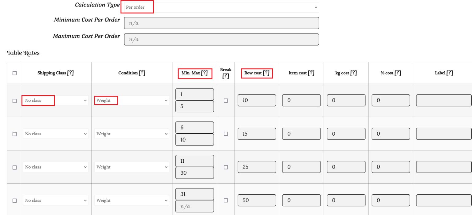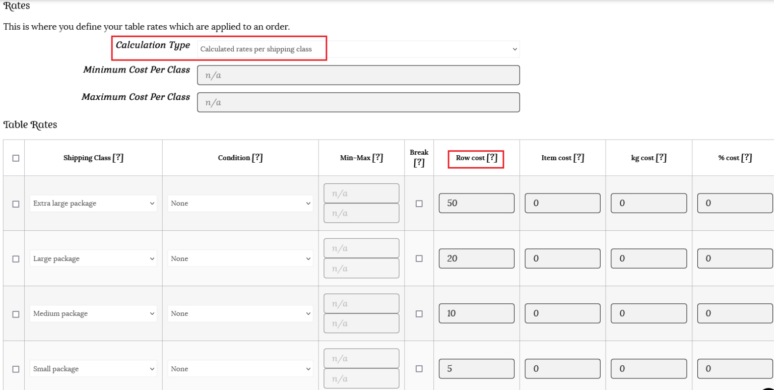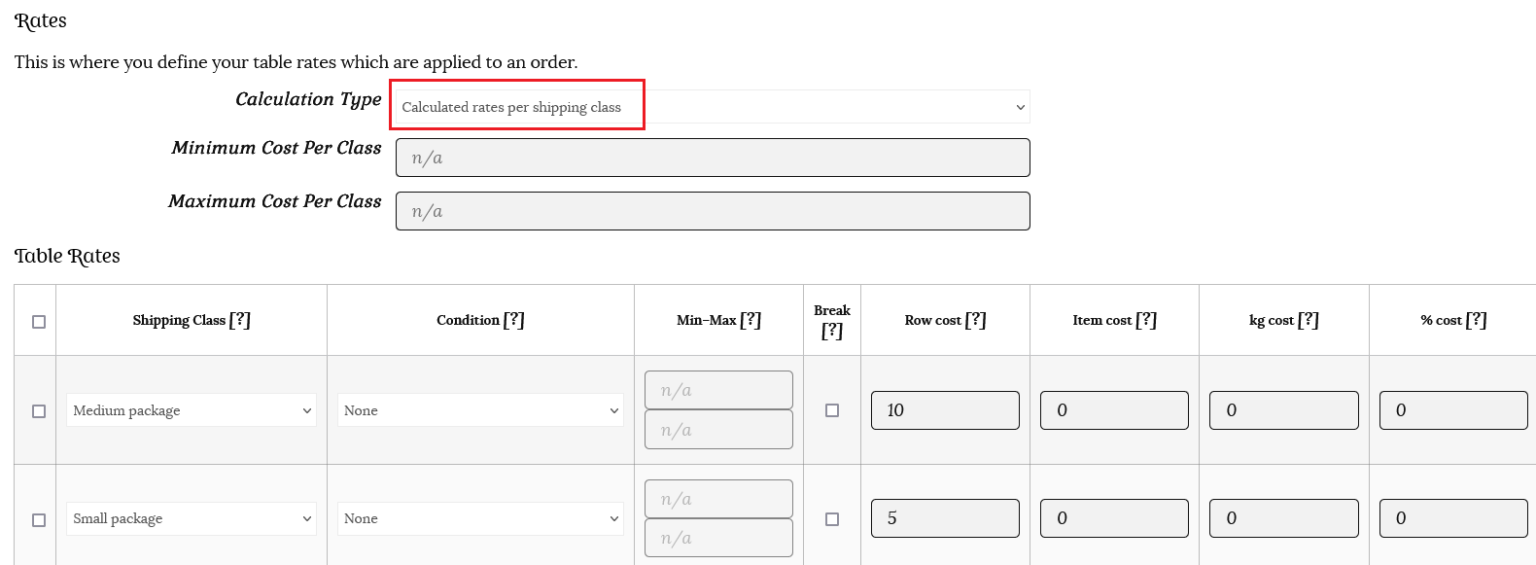 This time we will use the same row cost rates, but choose “Calculated rates per item” as the calculation type. This option counts the shipping based on the price, weight, etc. There is no label option for this calculation type.