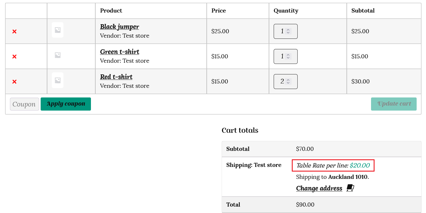 iii) the “Calculated rates per line item” will calculate the shipping based on each line in the cart with respect to the class. So in this case it will total 1 x $10 (black jumper) plus 1 x $5 (green t-shirt) plus 1 x $5 for both red t-shirts as they are on the same line. This totals $20.