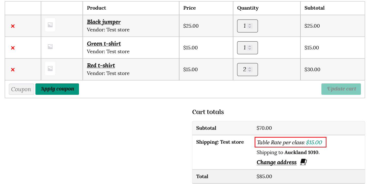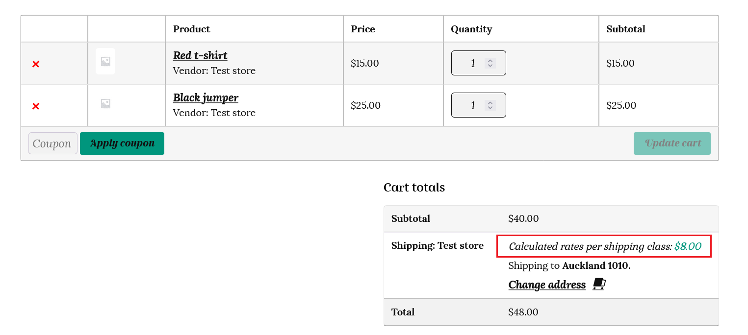 iv) the “Calculated rates per shipping class” method will add each different shipping class in the cart together. In this case $10 for the medium shipping class (black jumper) plus $5 for the small shipping class (this calculation type counts the 3 t-shirts as one small shipping class.) The total shipping cost will be $10 + $5 = $15.