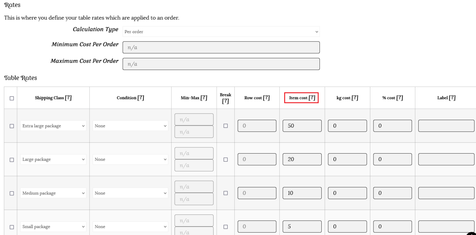 For the example below, we have used the following rates for our shipping calculations. The “Row cost” calculates the cost for shipping the total order. We are not adding any extra charge for each individual item (item cost column).