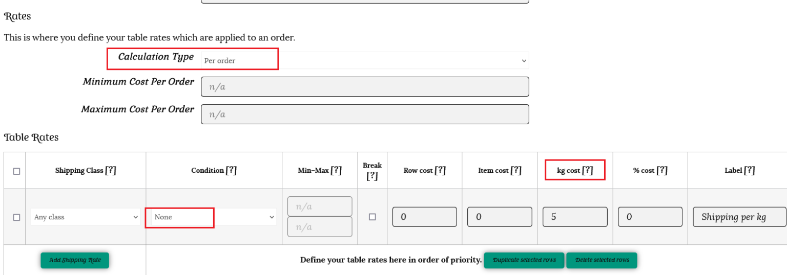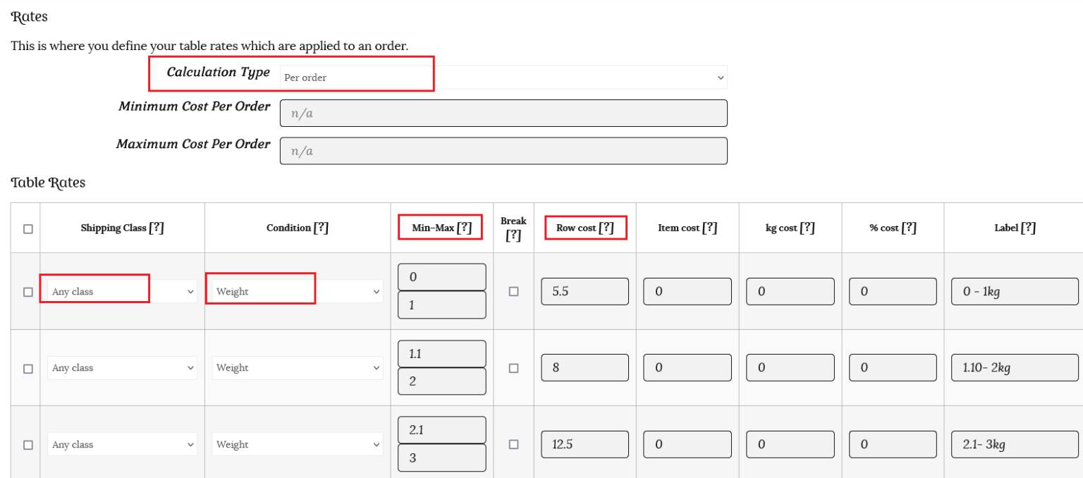 This time the calculation type is Per Order. This will calculate the total based on the weight of the entire order. He needs to create three rows, one for each rule he wishes to create. These will apply to any shipping class, with the weight condition, and a minimum and maximum weight applied.