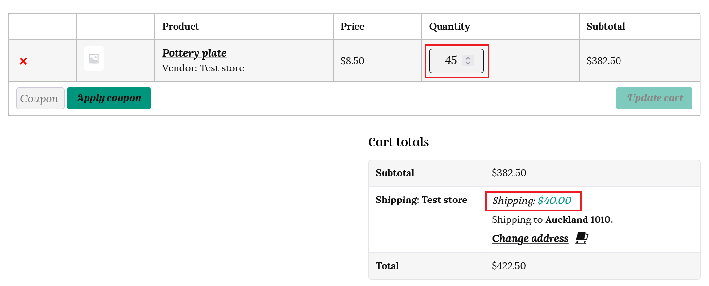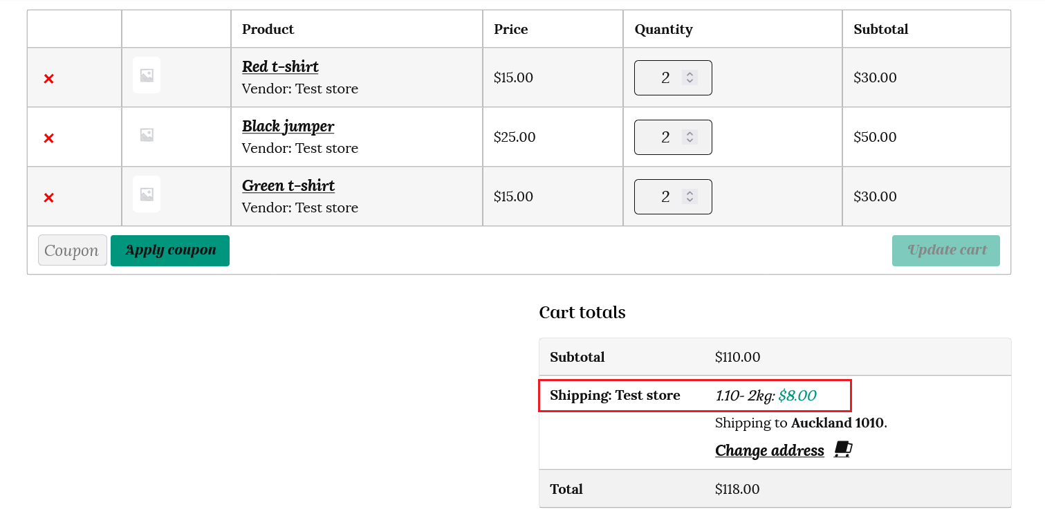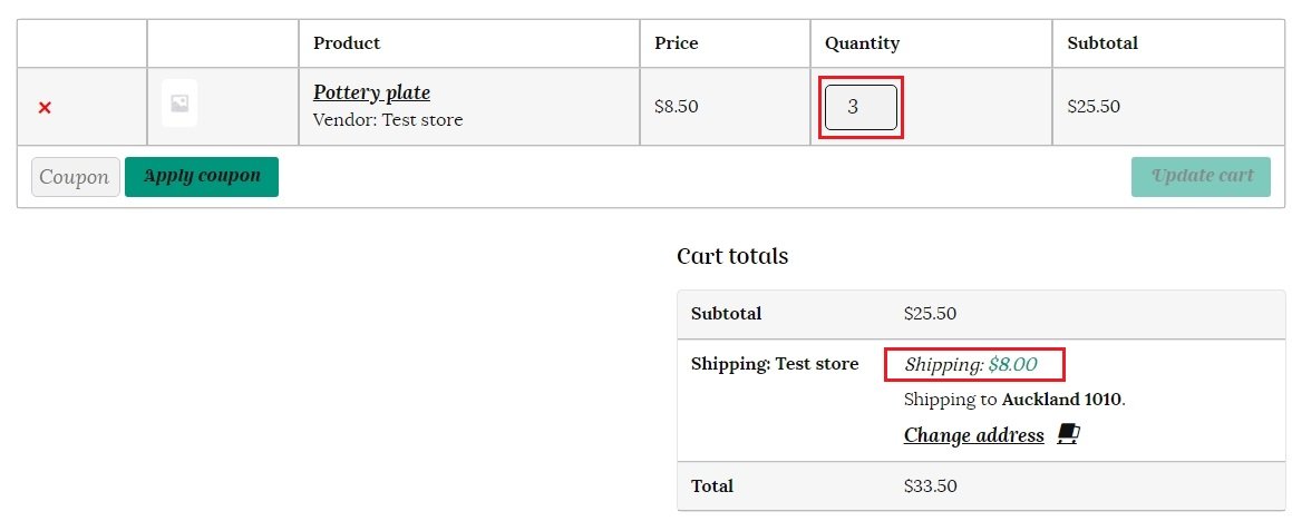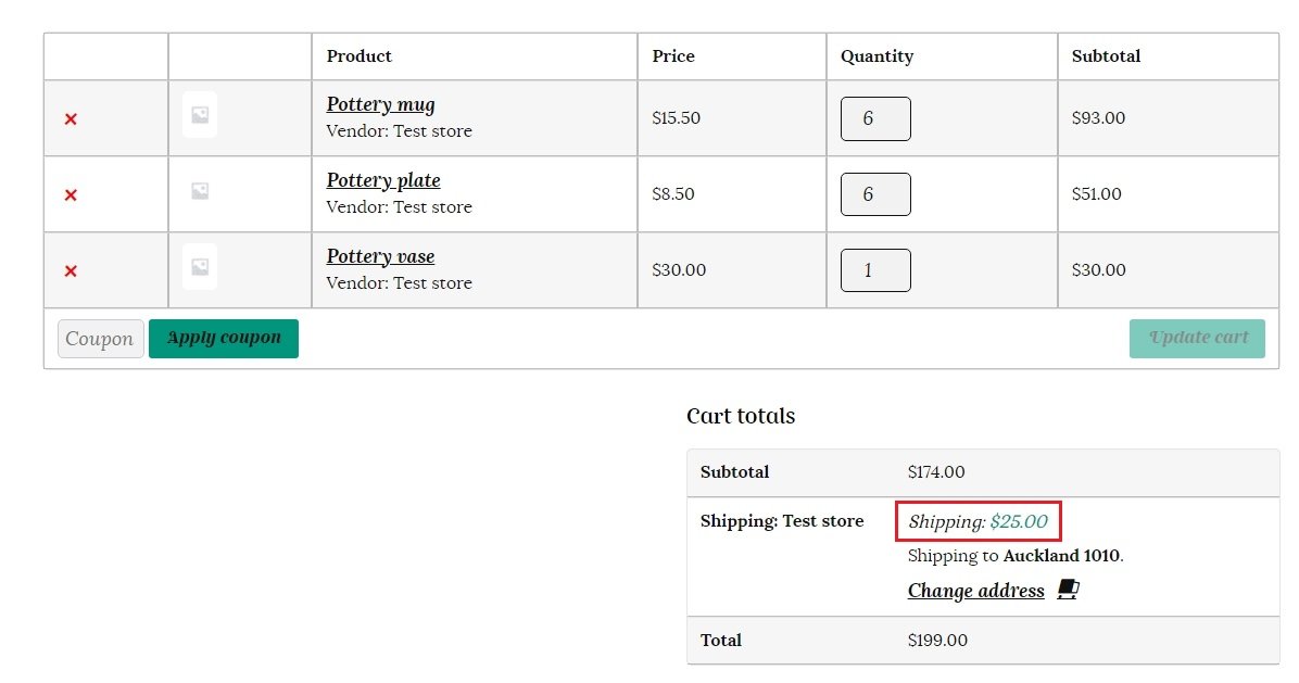 This is how the weight based shipping will be calculated in the customer’s cart. Total weight for all items is 6 x 1 kg (6 kg) for the pottery mugs, plus 6 x 0.5 kg (3 kg) for the pottery plates, plus 1 x 2 kg (2kg) for the pottery vase. This totals 11 kg, which costs $25 to ship on the table rate chart.