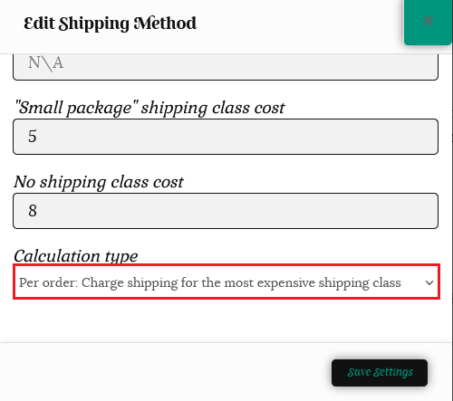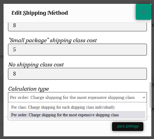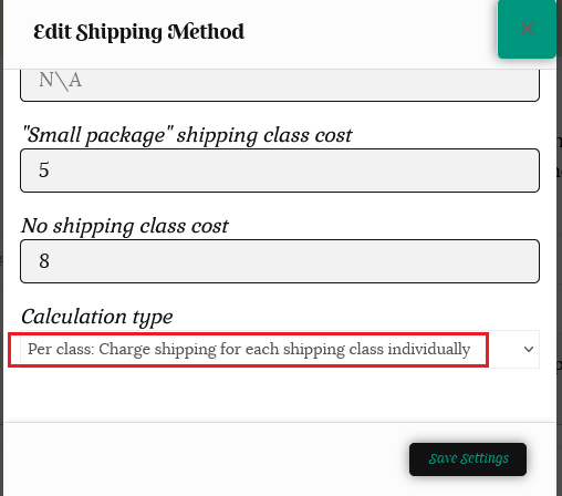 If we select “Calculated rates per shipping class” for the calculation type, each individual shipping class in the cart is totaled.