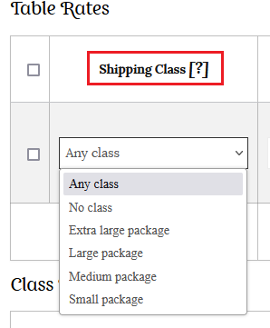 Choose the shipping class to which this rate will apply. You can also choose to apply the rate to items in any shipping class or in no shipping class. If you sell items that are all the same size, then you will not have to worry about setting shipping classes… you can just use the table rate option to set the shipping cost if multiple items are purchased.