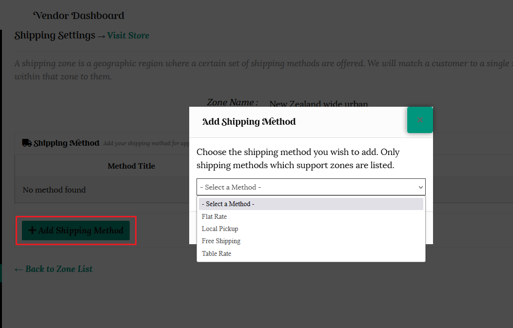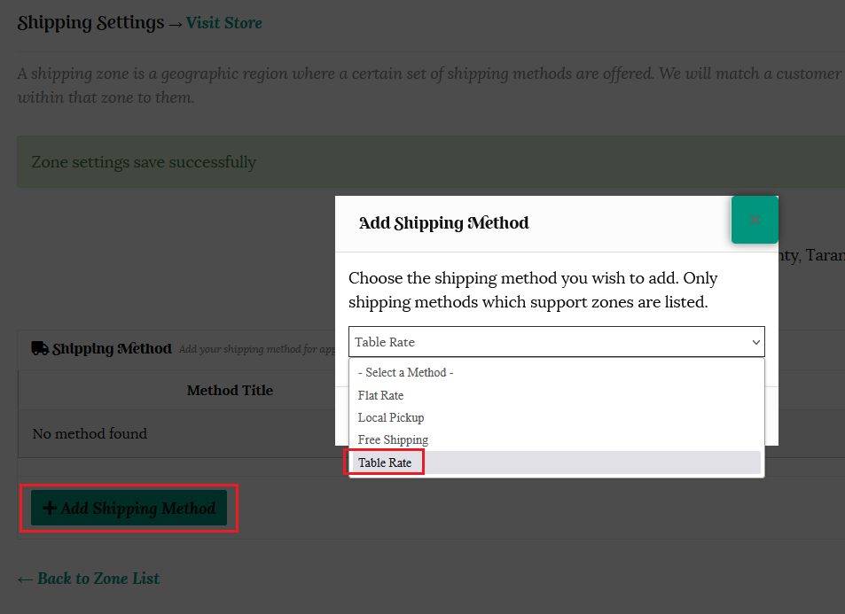 Choose your selected zone or group and click the “Add Shipping Method” button.