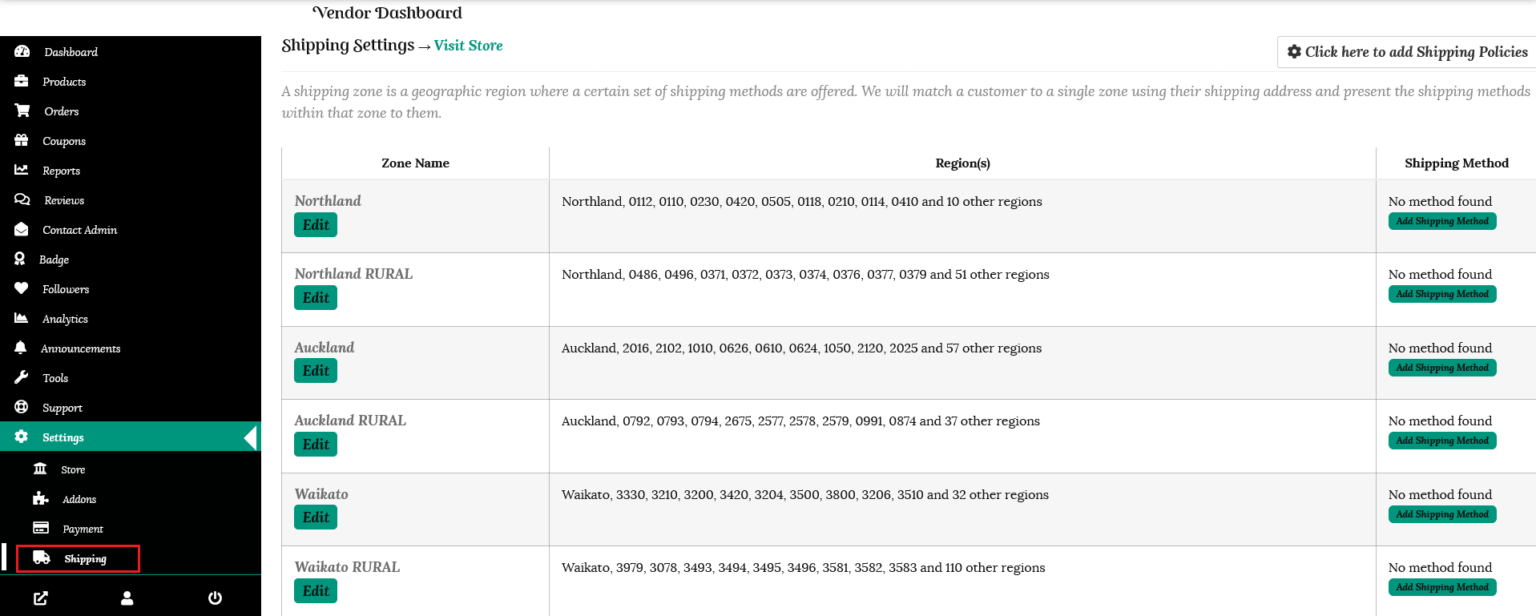 To configure the shipping costs for your store, go to the Settings tab in your dashboard and select “Shipping.” Here you will find the shipping zones for New Zealand listed.