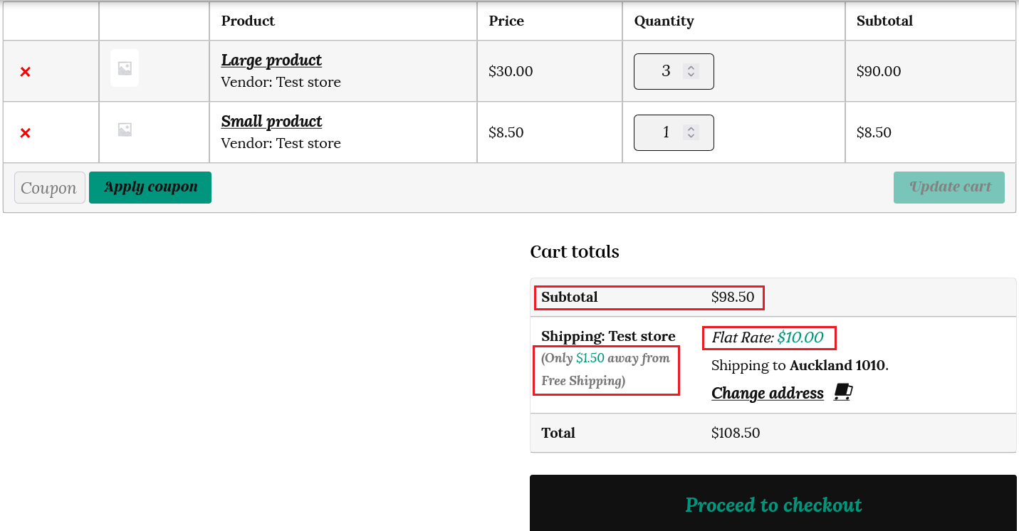 If the customer places an order under our example of $100, then flat rate shipping is charged. The customer is informed of the remaining amount required to gain free shipping.