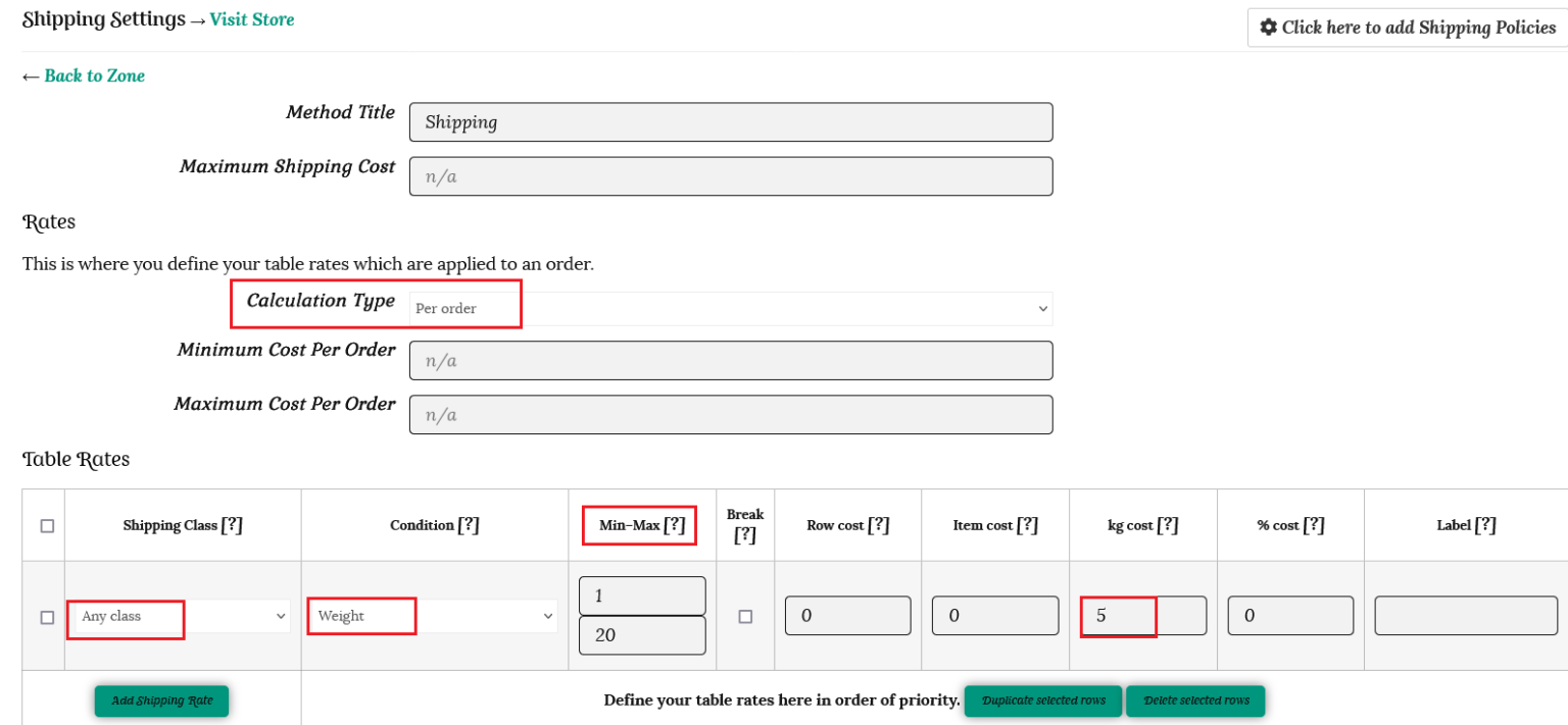 Then Lily fills out her table rates based on the total weight of the order in kg as below;