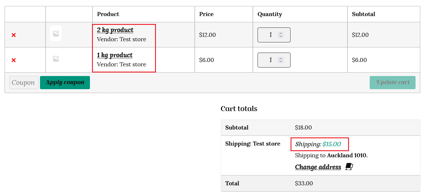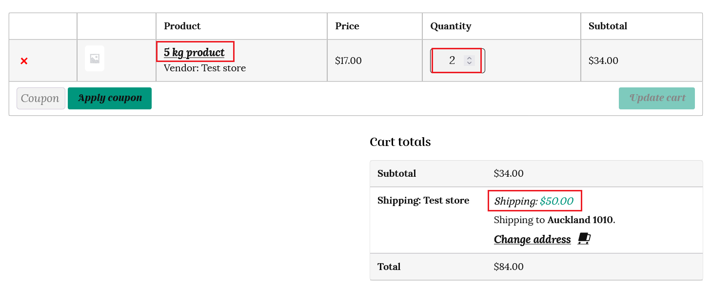 If the customer has 10kg of products in the cart, then the shipping will be calculated at $50 (10 x $5).