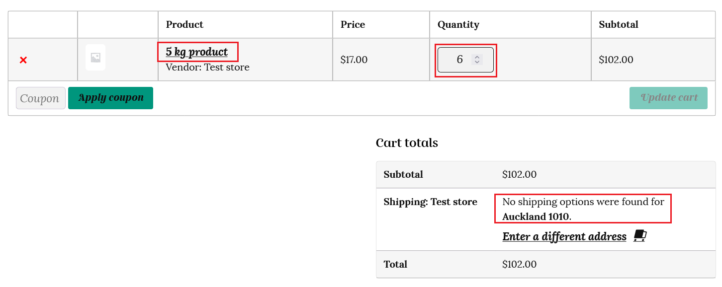 If the order exceeds the maximum amount mark, then it will show ” No shipping methods found.” For example, the customer has 30kg of products in their cart – as this is greater than the 20kg maximum, it will show as no shipping options found.