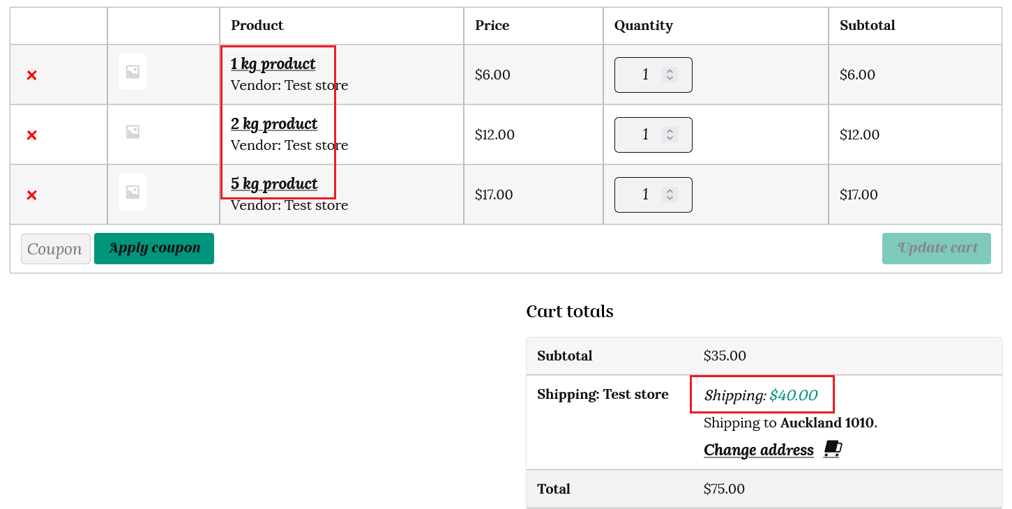 So if a customer has 3 products in their cart, with a total weight of 8kg, then the shipping will be calculated at 8 x $5 = $40.