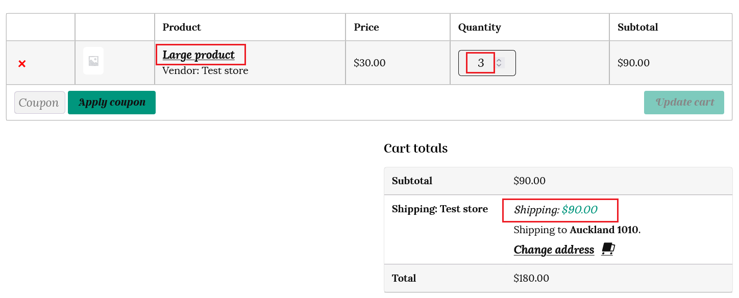 So, if a customer orders 3 large items weighing 3kg each that have the shipping class “Large package” then they will be charged 9kg x $10 = $90 for shipping.